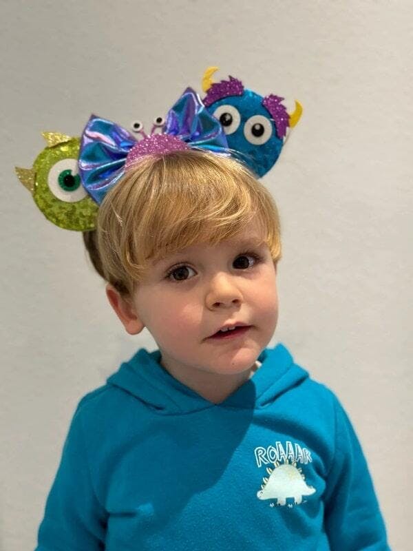 Orelhinhas de Paetê: Decoradas com paetês, com uma orelha apresentando Mike Wazowski e a outra Sulley.
