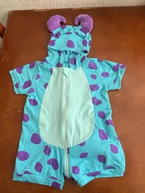 Macaquinho Bebê Fantasia Sulley Monstros S.A, peça única com capuz, chifrinhos acolchoados, cauda e zíper frontal para vestir com facilidade.