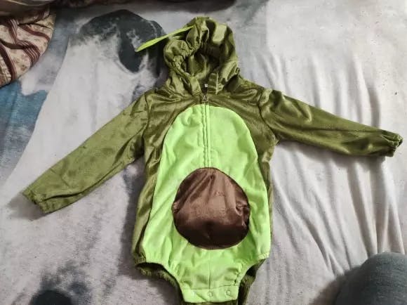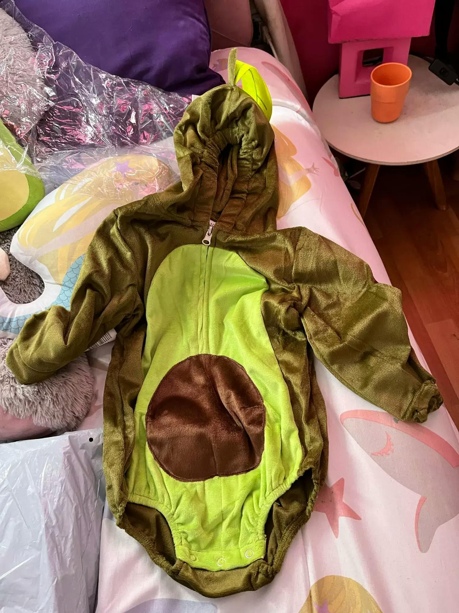 Design Temático: A fantasia simula um abacate, com uma "semente" em relevo na área central da barriguinha. O capuz inclui uma folhinha verde costurada no topo, adicionando um toque divertido e autêntico à fantasia.