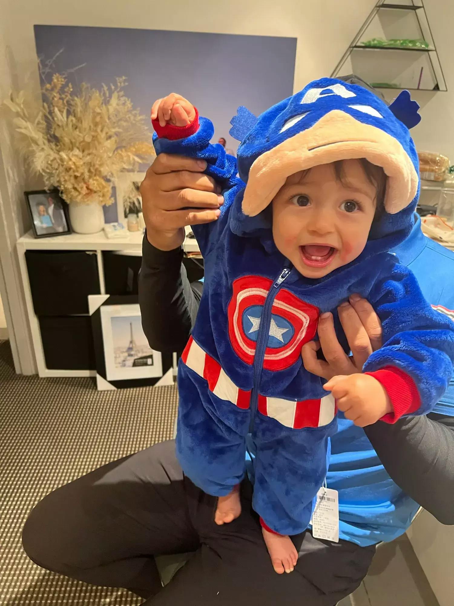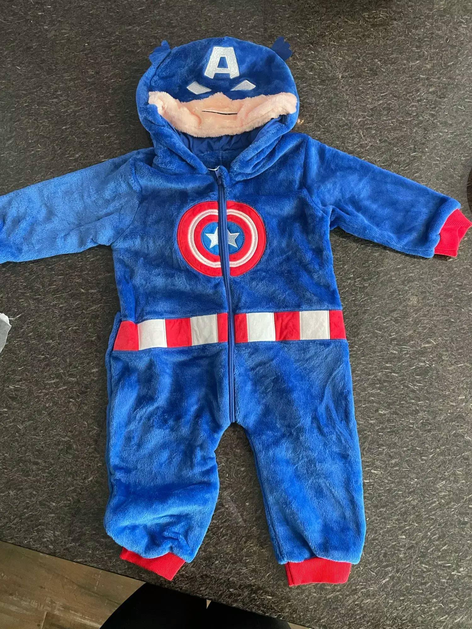 ⭐ Ideal para fazer um mesversário no tema do Capitão América! Este macacão possui capuz animado e fechamento em botões.