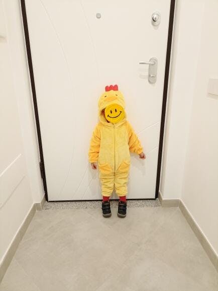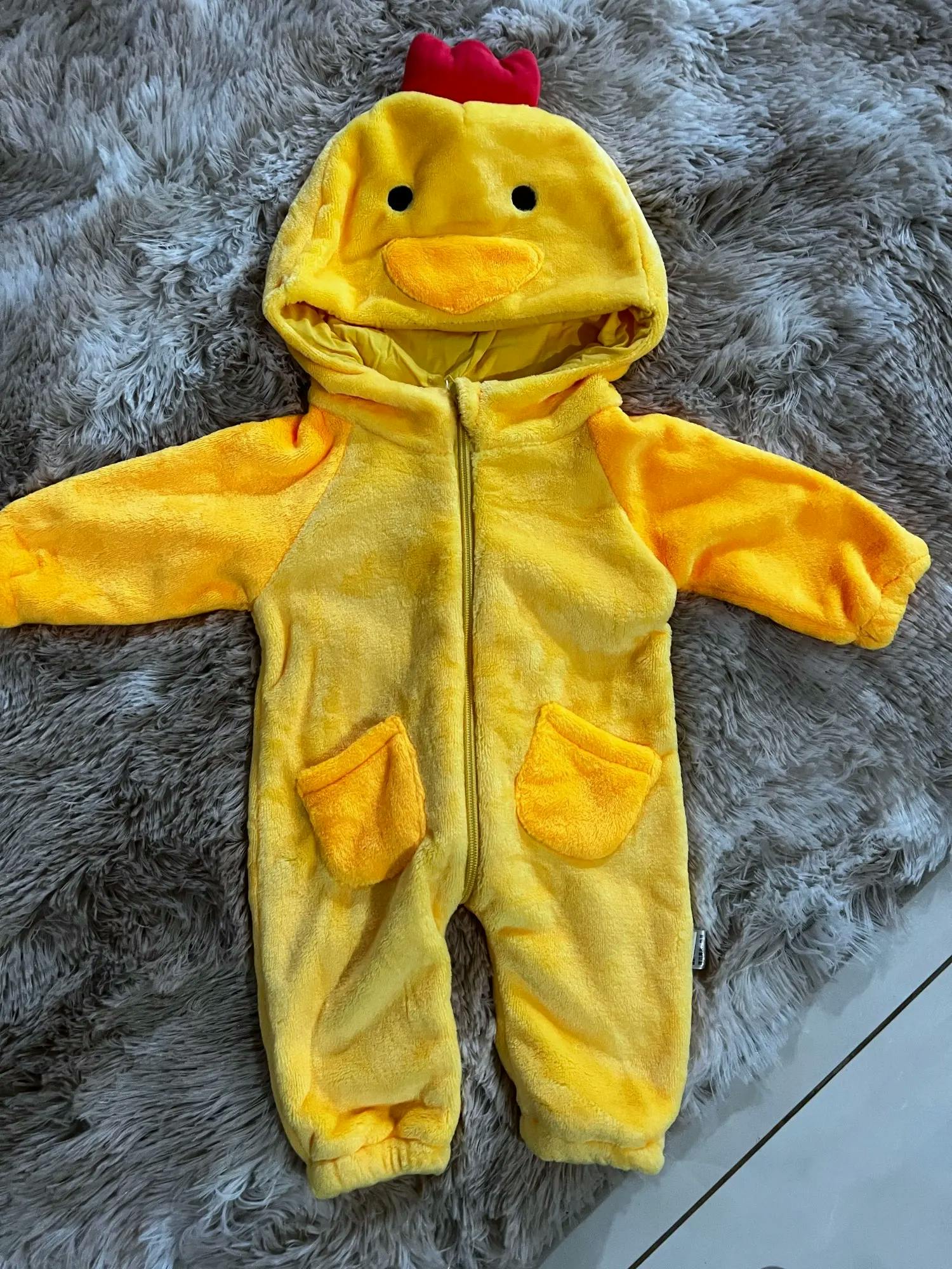 Design Divertido: Este macacão captura a essência de um pintinho fofo, com seu tecido amarelo vibrante e um capuz com detalhes que imitam a cabeça de um pintinho, incluindo olhinhos e biquinho.