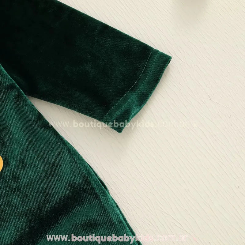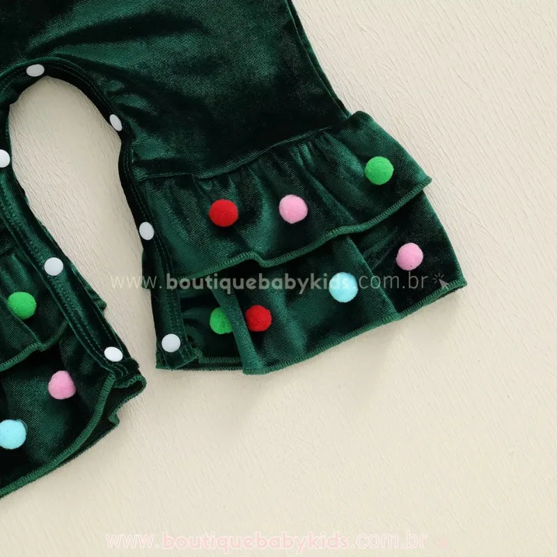 Detalhes Adoráveis: O modelo conta com gola em veludo vermelho contrastante e babadinhos nos ombros, além de camadas nas barras das perninhas decoradas com pompons coloridos que remetem aos enfeites natalinos.