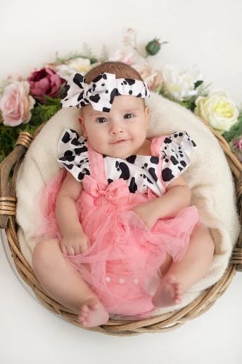 Design Encantador: Apresenta um design encantador de vaquinha que é perfeito para sua pequena arrasar nas fotos.