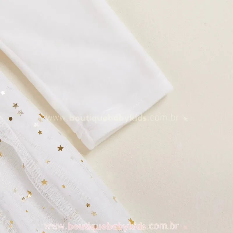 Detalhes Encantadores: Mangas longas para maior aconchego e saia rodada com acabamento em tule para um visual mágico.