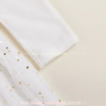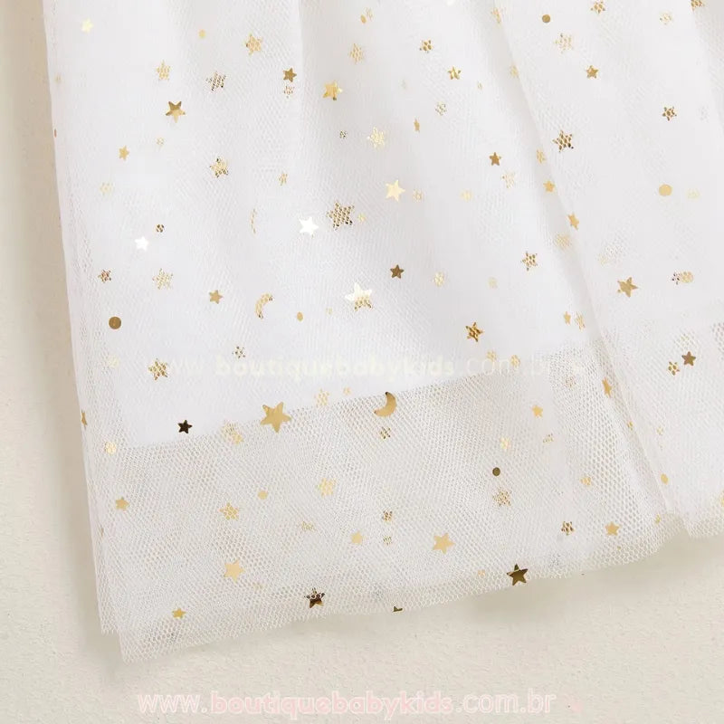 Design Encantador: Vestido branco com estampa divertida de rostinho de boneco de neve e saia em tule delicado com aplicação de estrelinhas douradas que brilham em cada movimento.