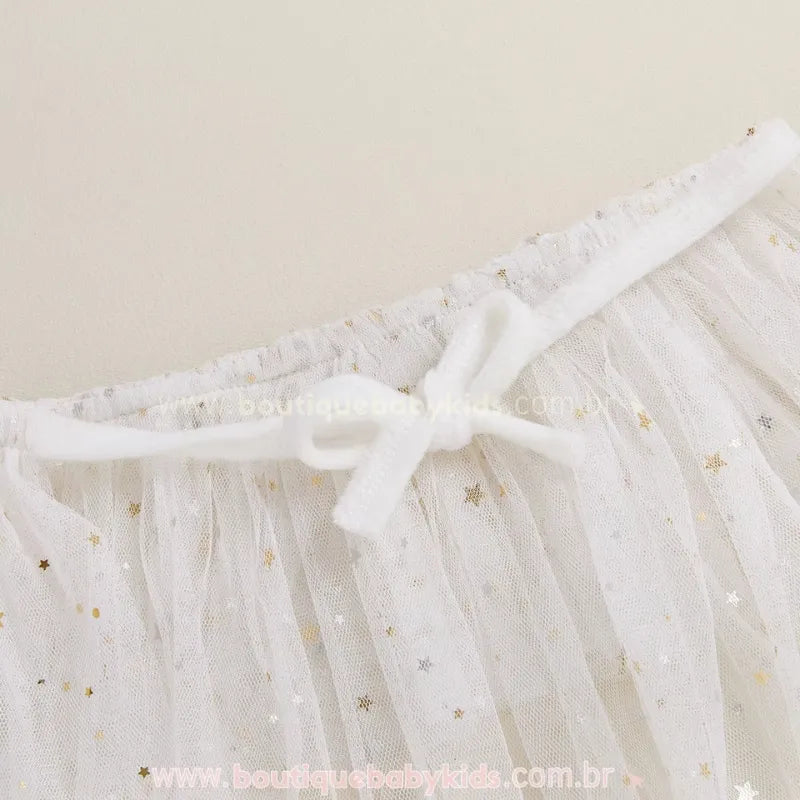 Material de Qualidade: Confeccionado em poliéster macio e confortável, com saia em tule leve que proporciona movimento gracioso e cheio de charme.