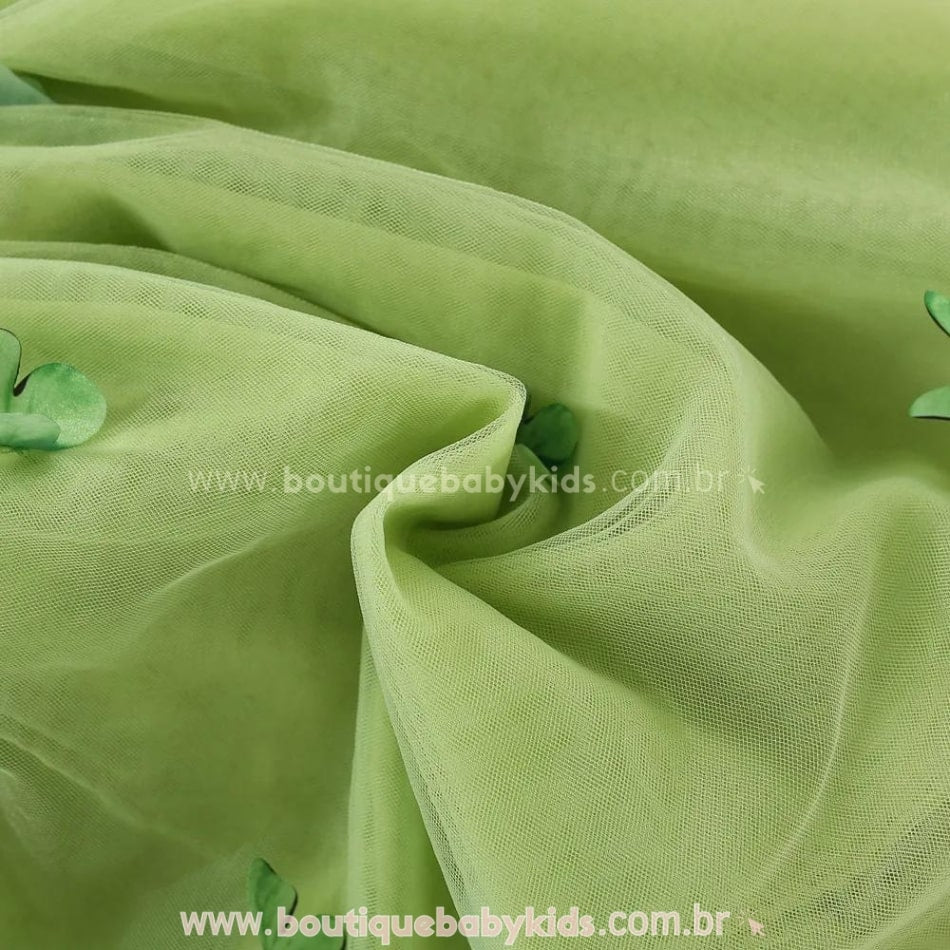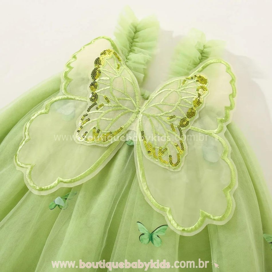 Design Encantador: Composto com camadas de tule com pequenas borboletas aplicadas e uma grande asinha fixada nas costas o que adiciona um toque extra de charme.