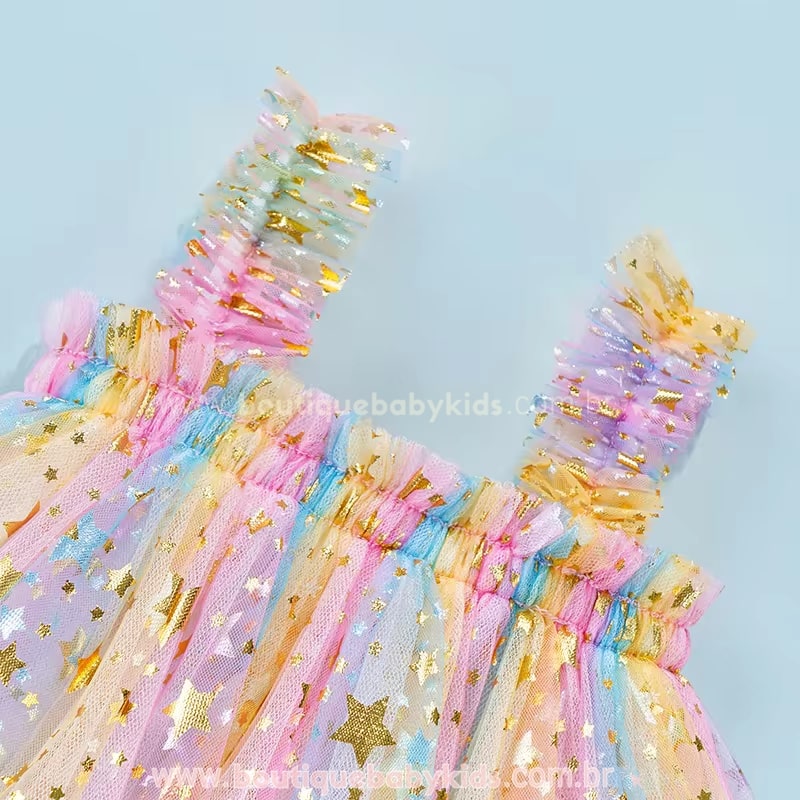 por⭐Encante com o Vestido Bebê Estrelado Tule Colorido! Feito com tecidos de alta qualidade, combina conforto e estilo. O tule colorido e o padrão estrelado conferem um visual alegre e encantador, ideal para destacar a fofura dos pequenos.