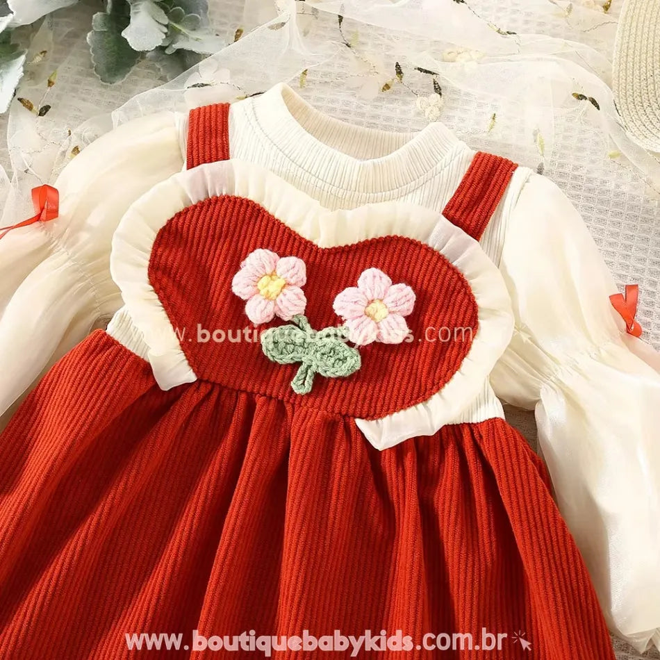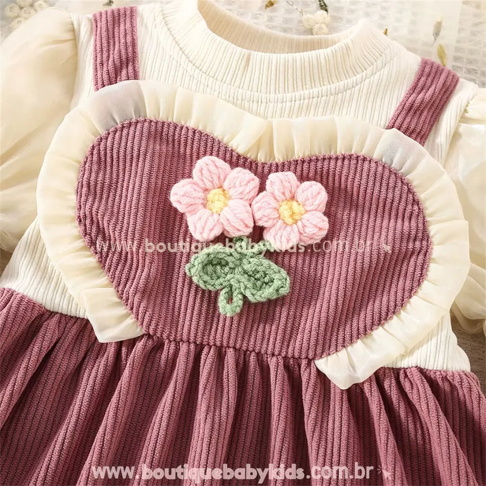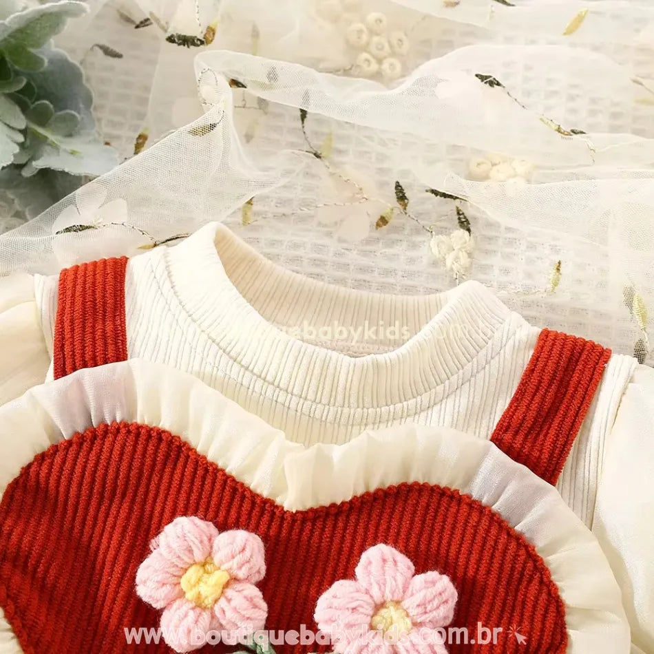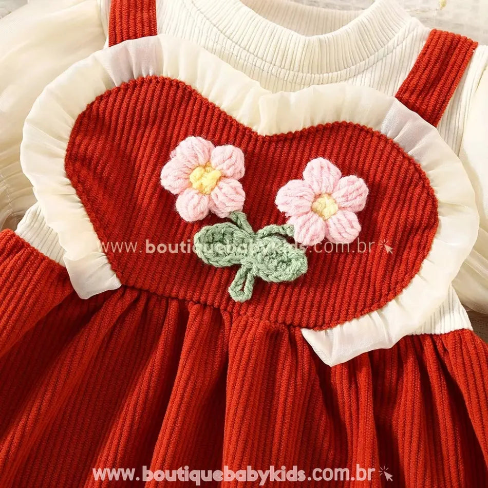 Design Encantador: O vestido modelo salopete apresenta um formato de coração com bordado artesanal de flores, cercado por babados delicados que adicionam um toque romântico e sofisticado.