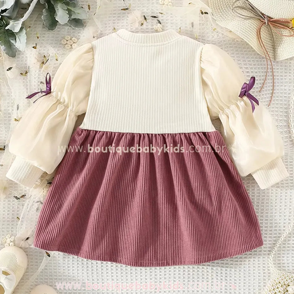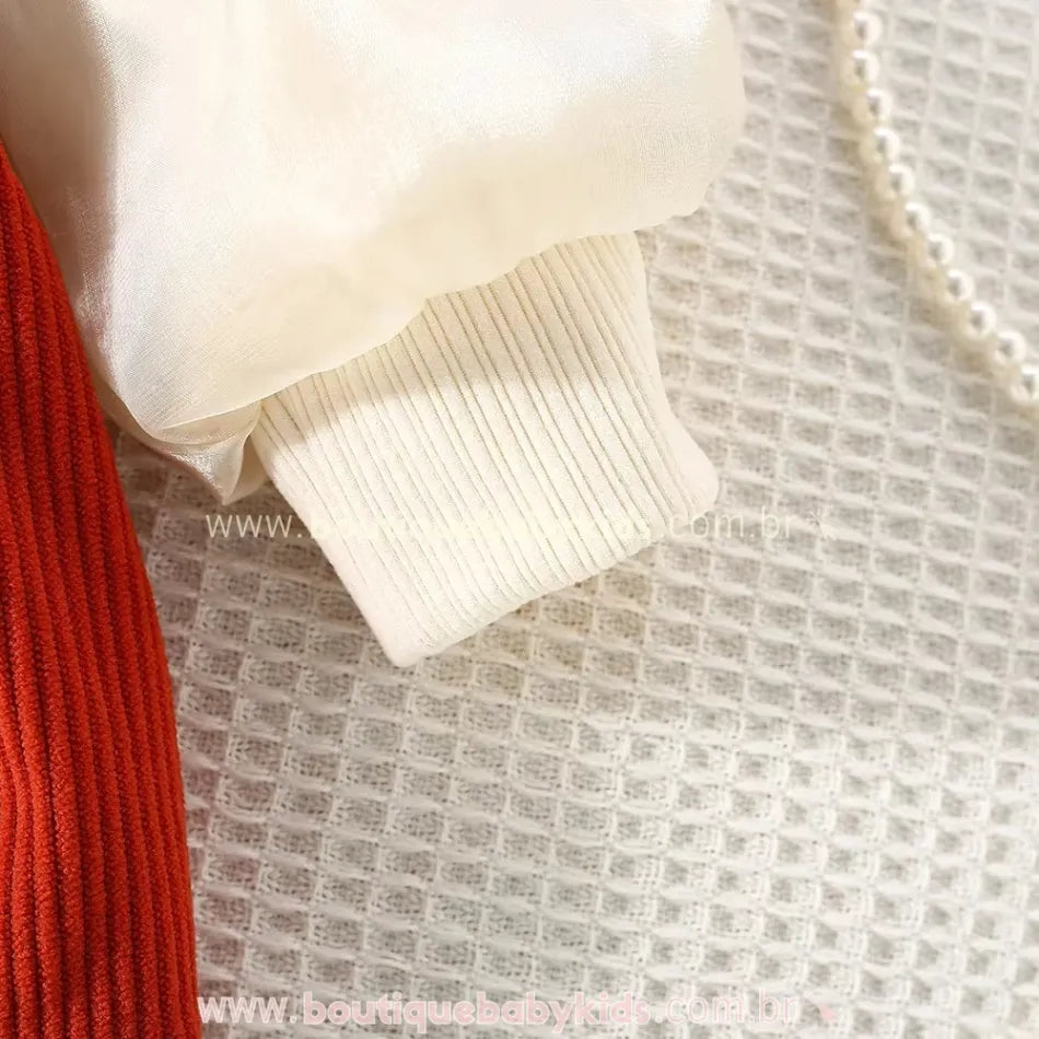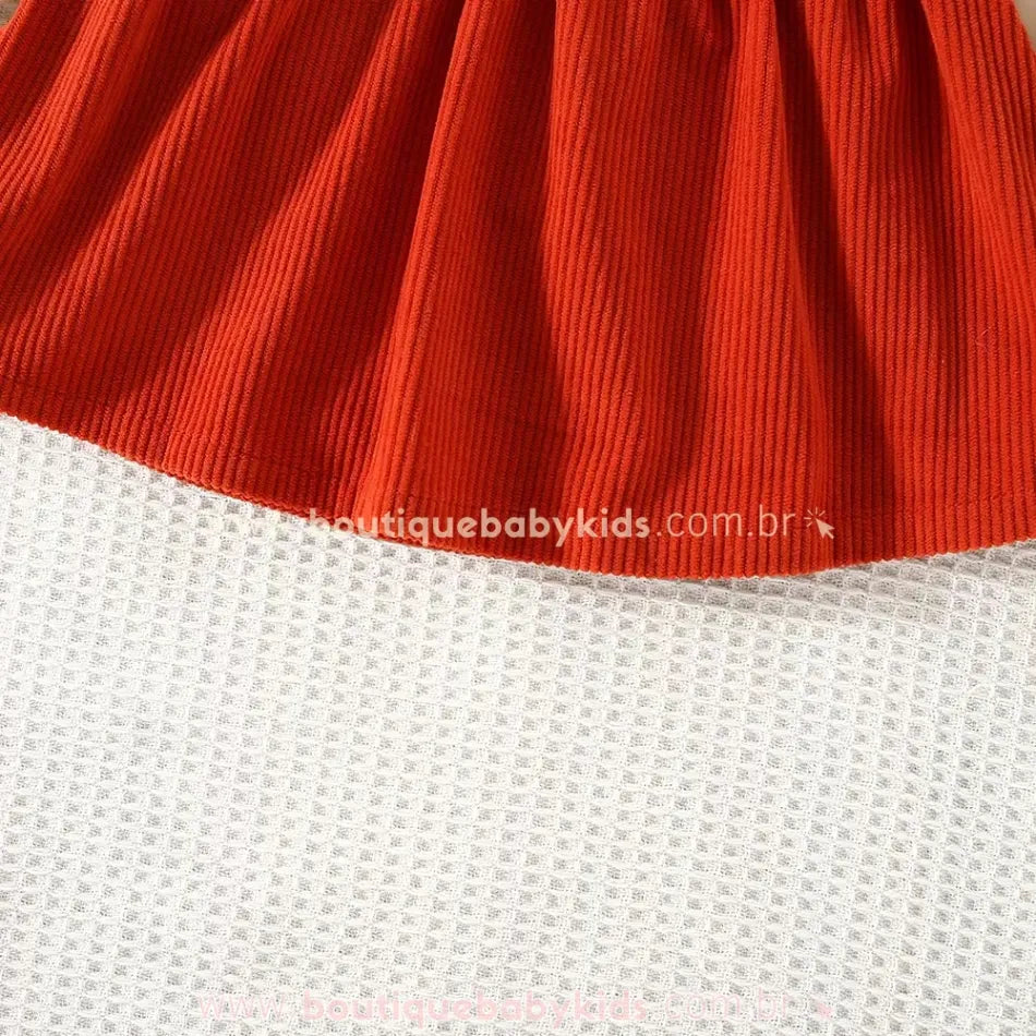 Material de Qualidade: Confeccionado com tecidos de alta qualidade, unindo o veludo canelado na saia para um toque macio e elegante, enquanto a parte superior utiliza algodão, garantindo conforto. Os detalhes das mangas contam com tecido leve e delicado, proporcionando suavidade ao toque e movimento fluido.