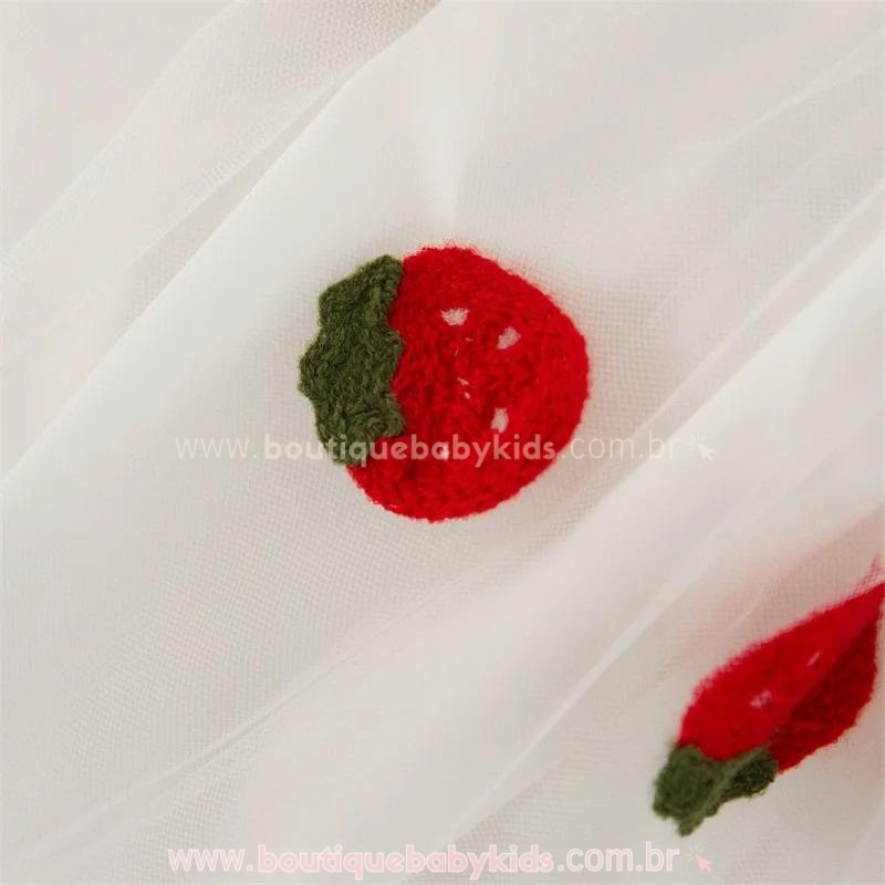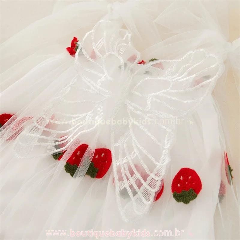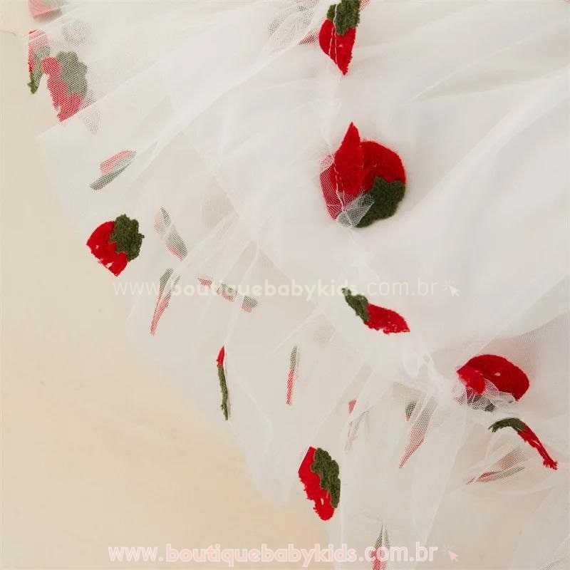Design Encantador: Seu bordado de moranguinho no tule adiciona um toque de elegância e volume, tornando o vestido ainda mais especial e bonito.