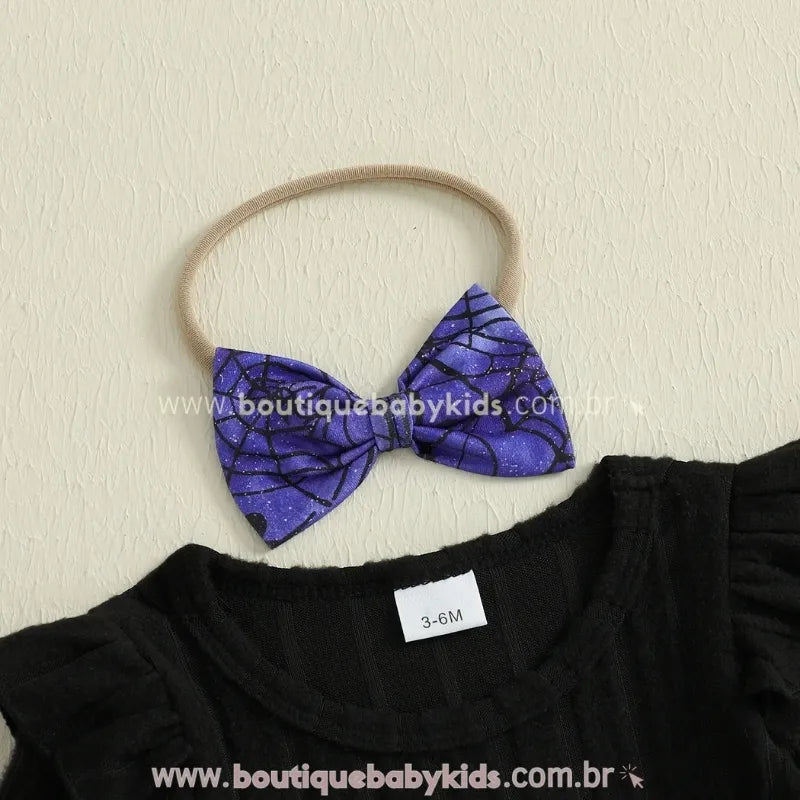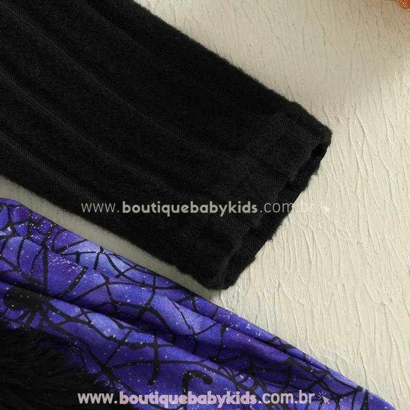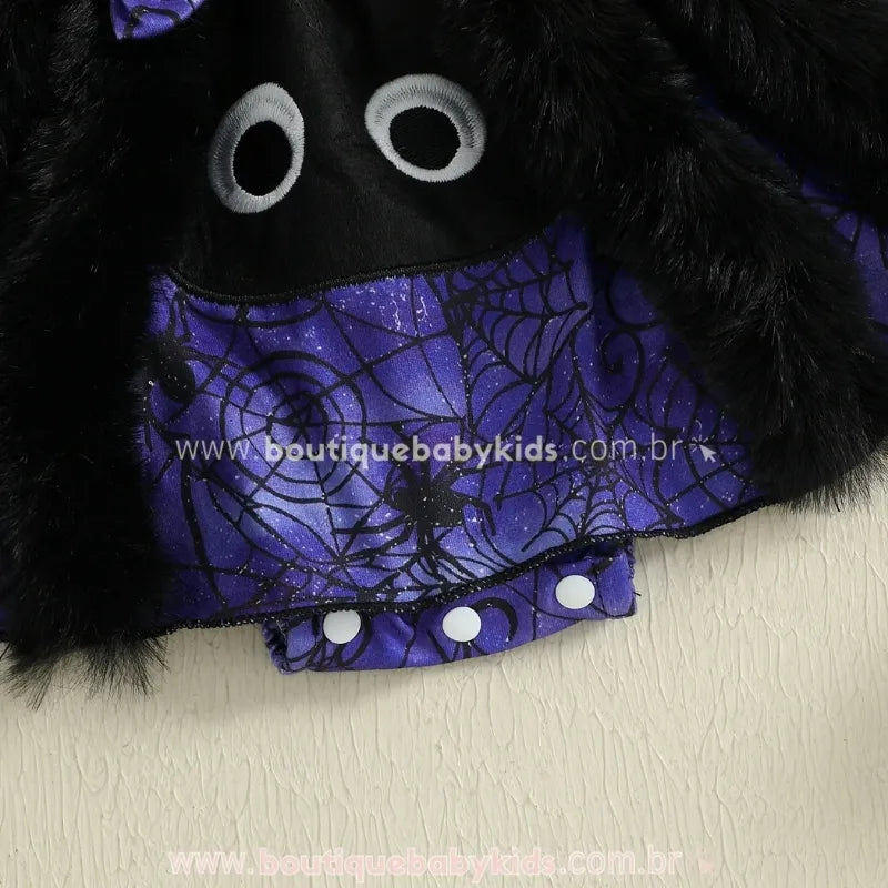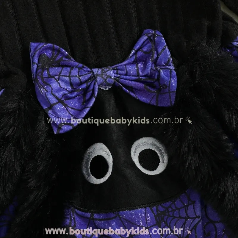 Saia de Aranhinha: Saia rodada com estampa de teias de aranha roxas, decorada com olhos bordados e detalhes em pelúcia preta que simulam as perninhas da aranha, criando um visual lúdico e criativo.