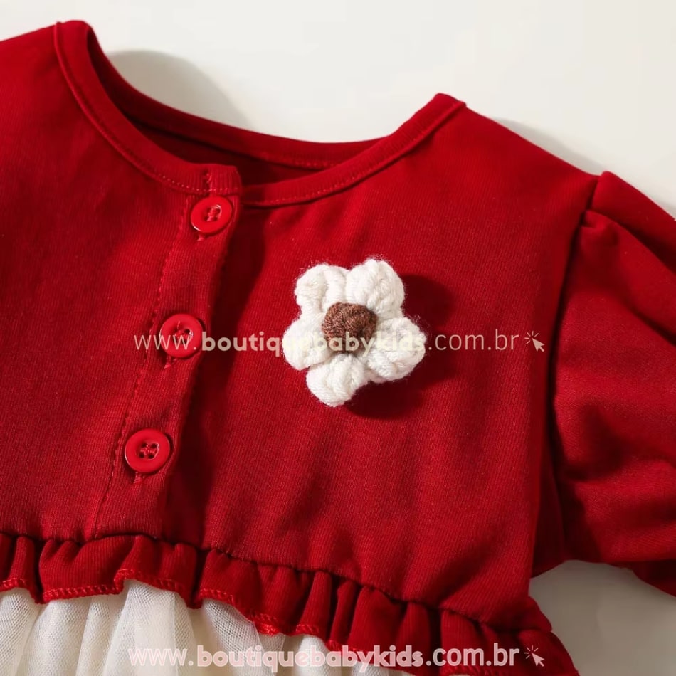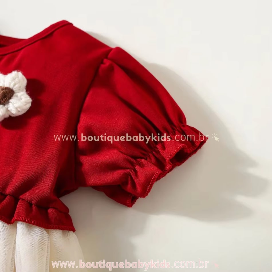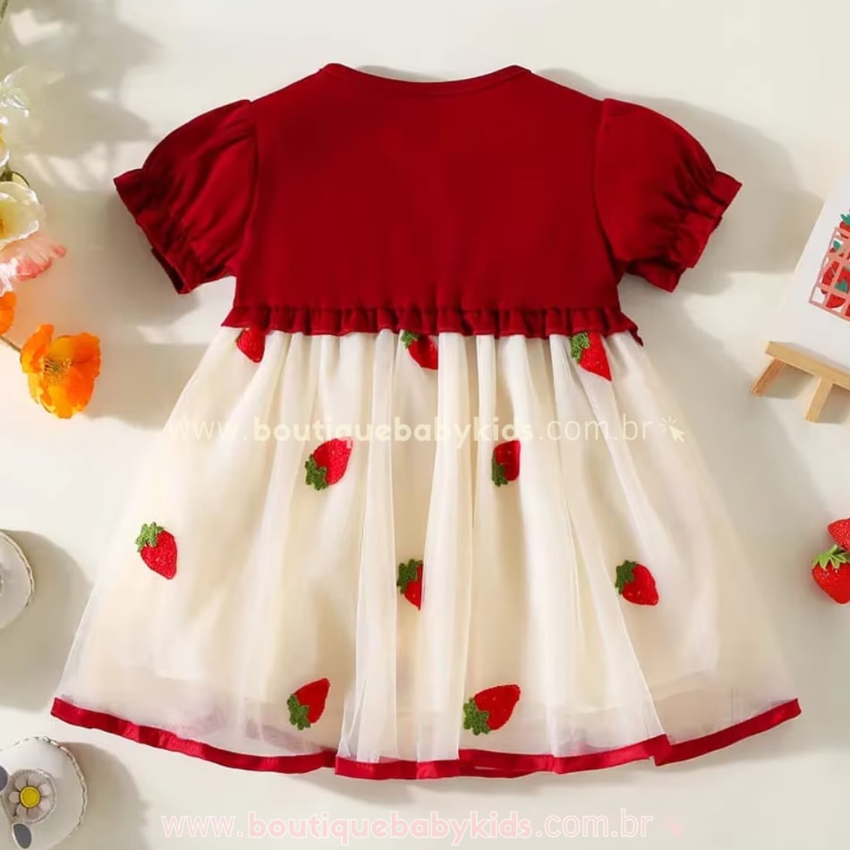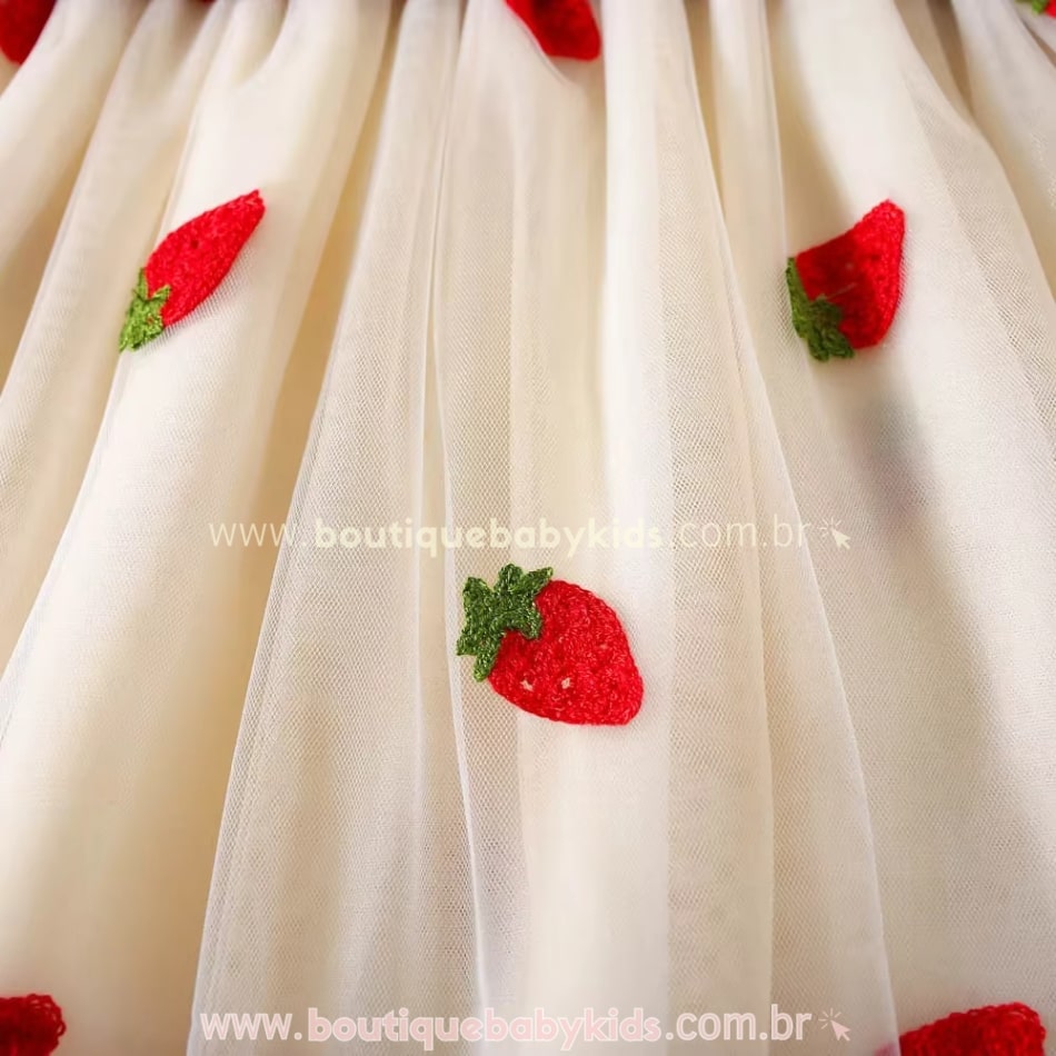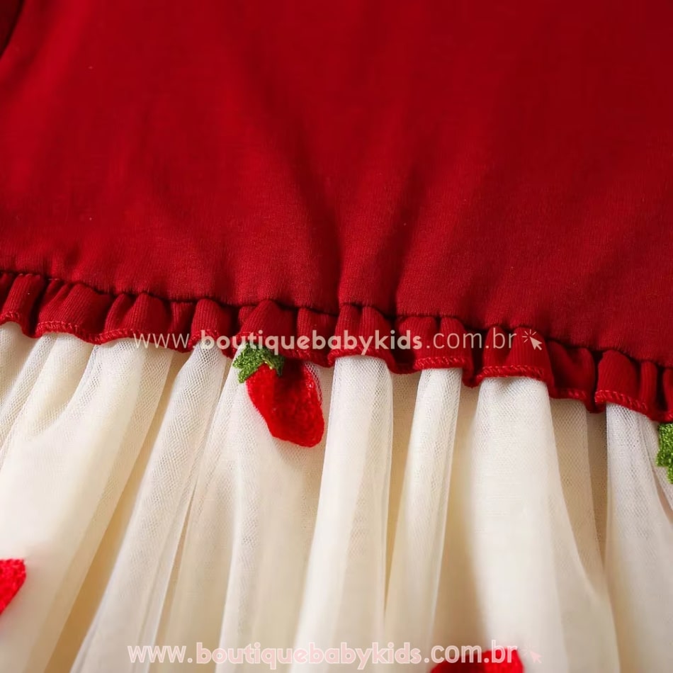 Design Encantador: A parte superior é vermelha com detalhes delicados, incluindo uma aplicação de flor em crochê no peito. A saia de tule possui bordados de pequenos morangos vermelhos, criando um visual alegre e fofo.