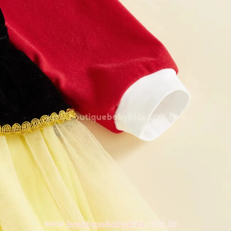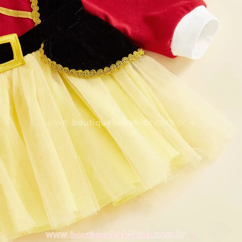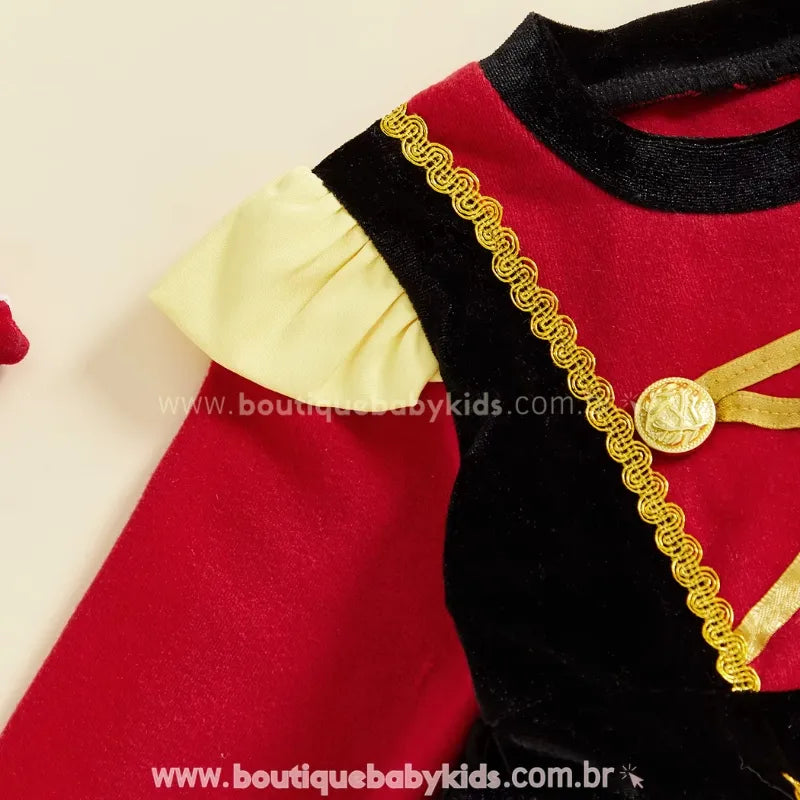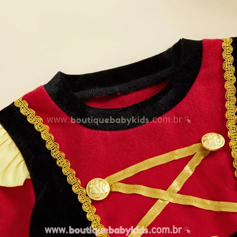 Design Temático de Quebra-Nozes: Vestido em cores vibrantes (vermelho, amarelo e preto), com detalhes em dourado e gola charmosa, lembrando a farda elegante do personagem clássico.