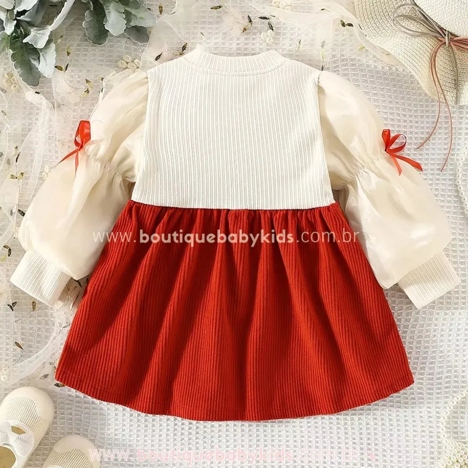 👶🏻O Vestido Bebê Doçura com Laços de Cetim é uma peça que mistura charme e delicadeza em cada detalhe, ideal para momentos especiais. A parte superior em tom vibrante de vermelho adiciona um toque de sofisticação ao design, enquanto a saia em off-white com pequenos laços de cetim vermelho oferece um contraste elegante e harmonioso, destacando a doçura do vestido.