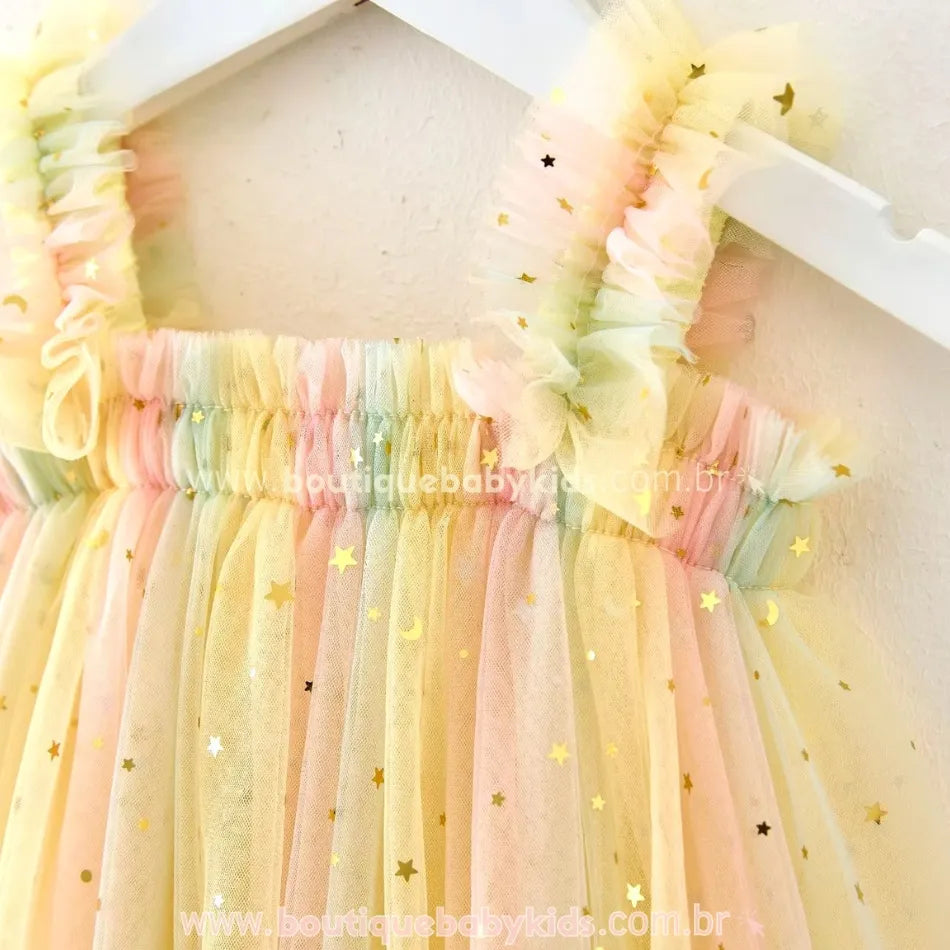 Detalhes Celestiais: Camada superior de tule transparente com estampas de luas, estrelas e planetas em tons pastel, que criam um efeito mágico e encantador.