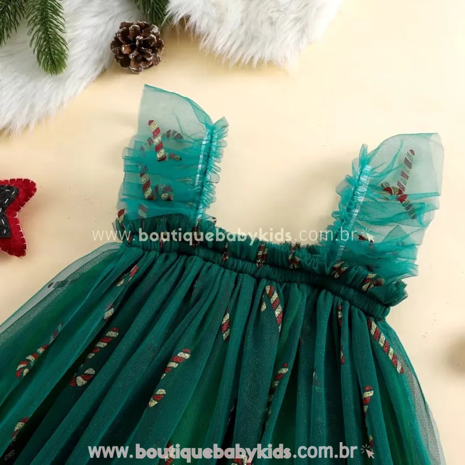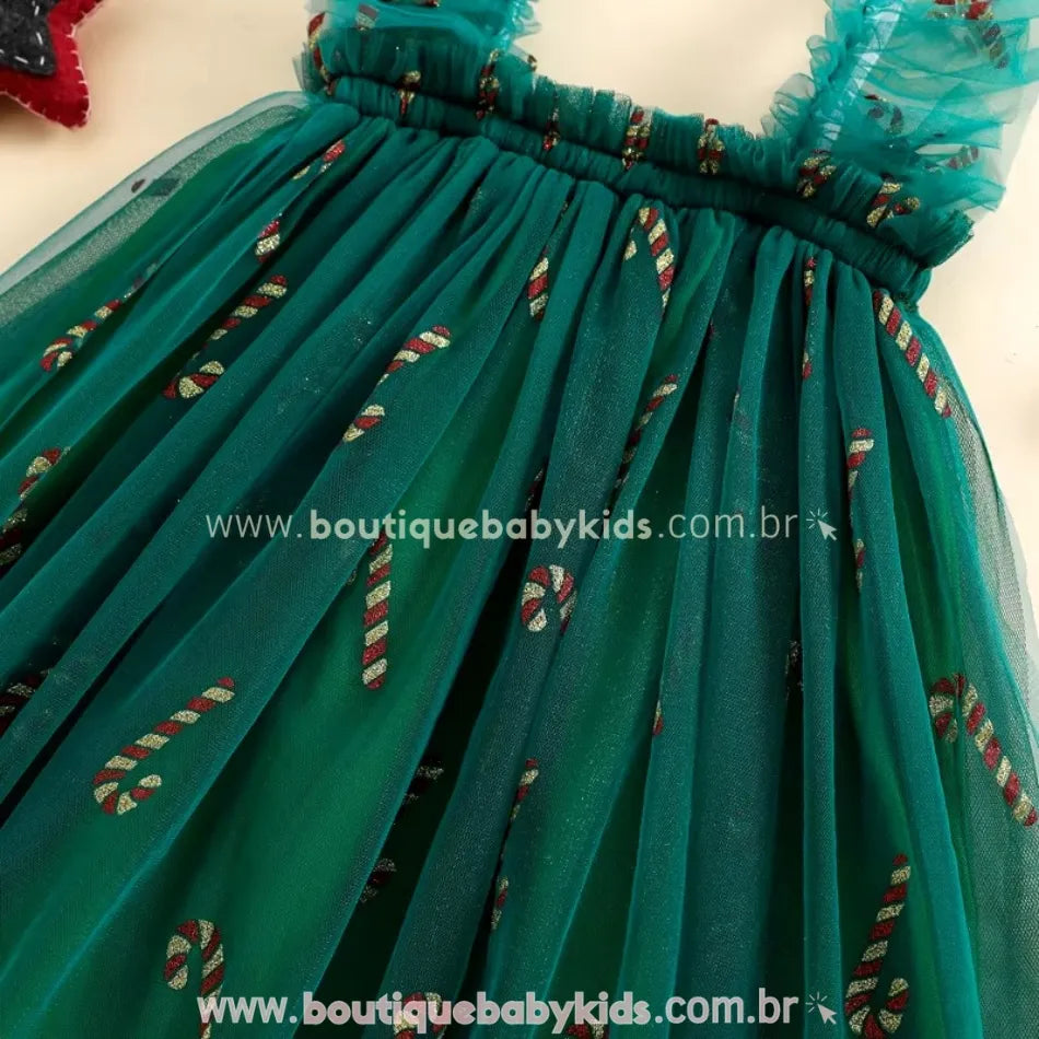 🎄O Vestido Temático de Natal Bengala Doce com Tule é a escolha perfeita para deixar sua pequena no clima festivo com muito estilo e encanto. Confeccionado em tecido leve e confortável, ele conta com uma sobreposição de tule adornado com delicadas bengalas doces em dourado e vermelho, refletindo a magia e a doçura do Natal.