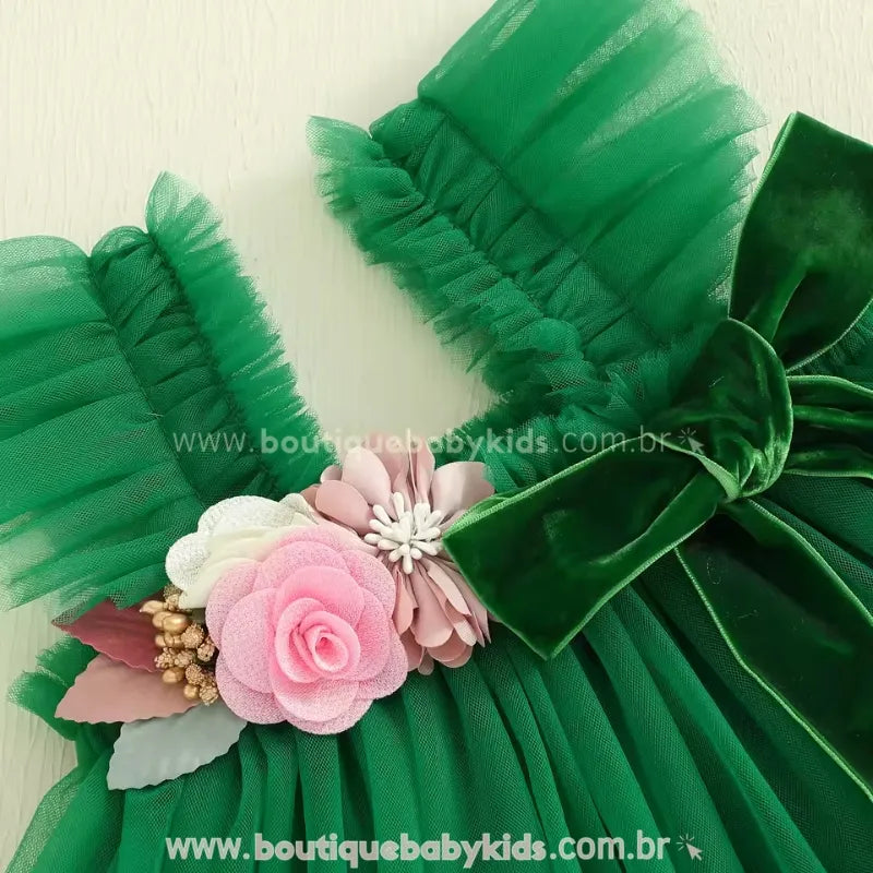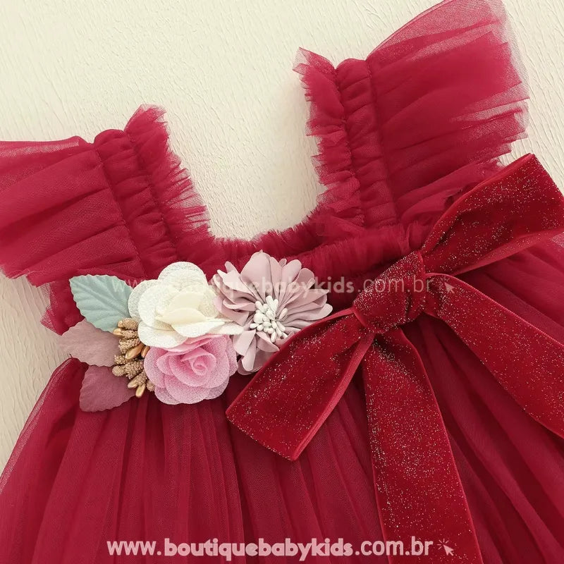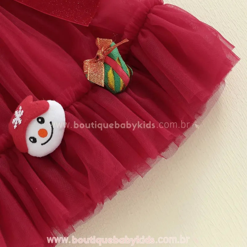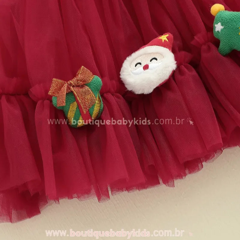 Detalhes Encantadores: Faixa com flores delicadas aplicadas, laço de veludo elegante e enfeites natalinos fofos como Papai Noel e presentinhos, que deixam o vestido ainda mais especial.