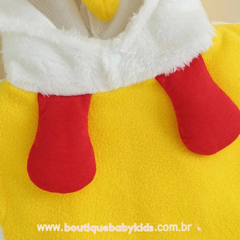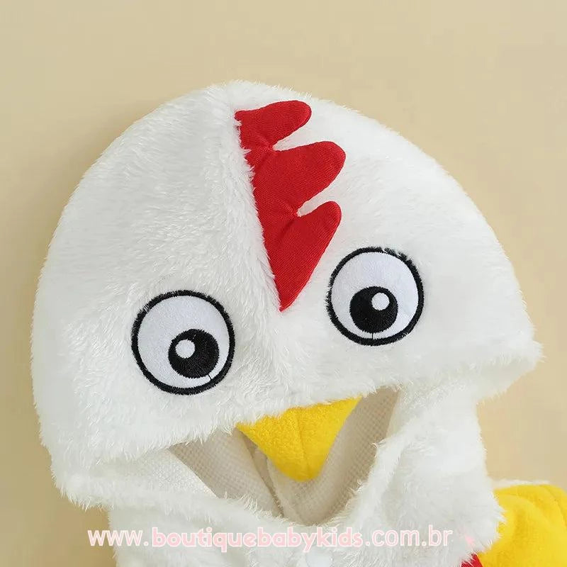 Capuz Fofinho: Possui um capuz acoplado que representa a cabeça do galo, incluindo detalhes como a crista vermelha, olhos expressivos e bico amarelo.