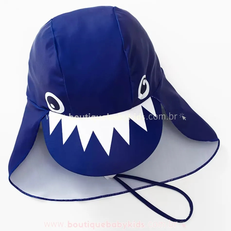 Chapéu Temático Tubarão: Inclui chapéu com design criativo, destacando olhos, dentes e aba frontal. Conta com proteção para o pescoço e ajuste por amarração para garantir firmeza e conforto.