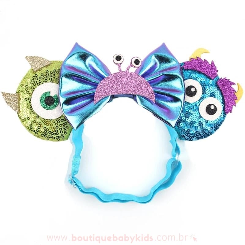 Orelhinhas de Paetê: Decoradas com paetês, com uma orelha apresentando Mike Wazowski e a outra Sulley.