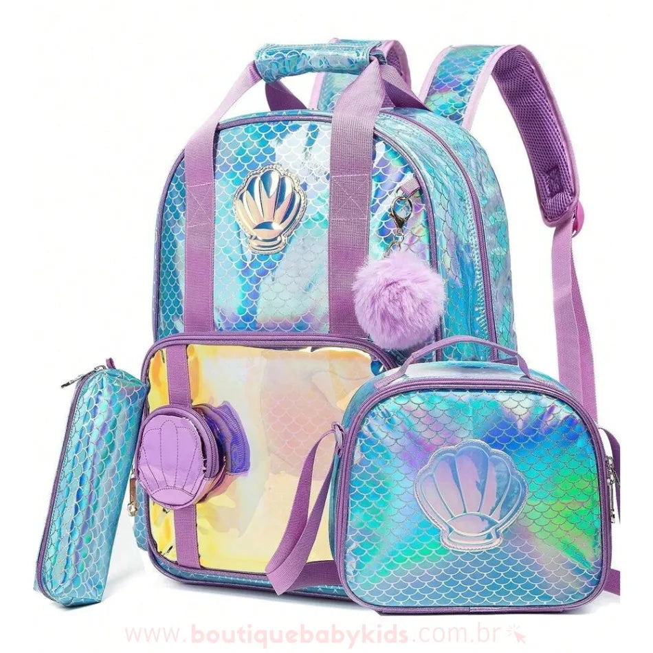 🧜🏼‍♀️O Kit Mochila Costas com Lancheira e Estojo Sereia Holográfica é a escolha perfeita para crianças que adoram um toque de magia e brilho no dia a dia. Inspirado no universo das sereias, este conjunto combina funcionalidade e design encantador, ideal para a rotina escolar.