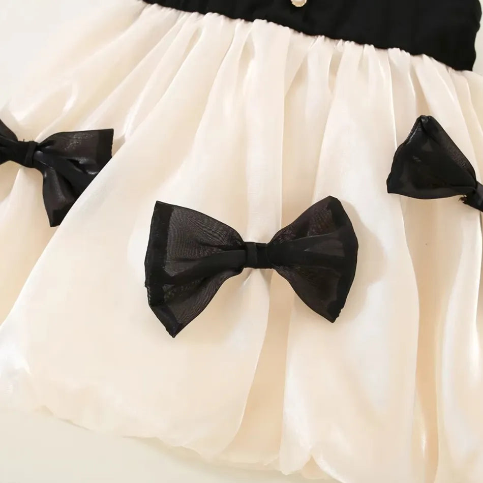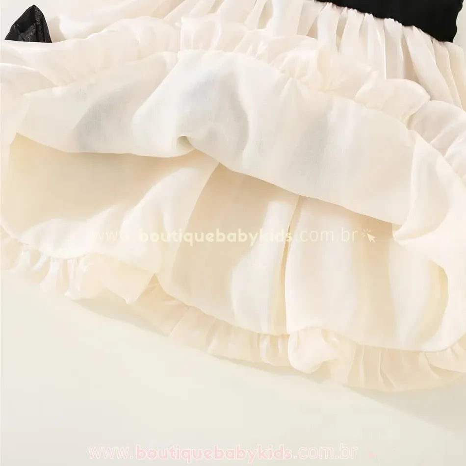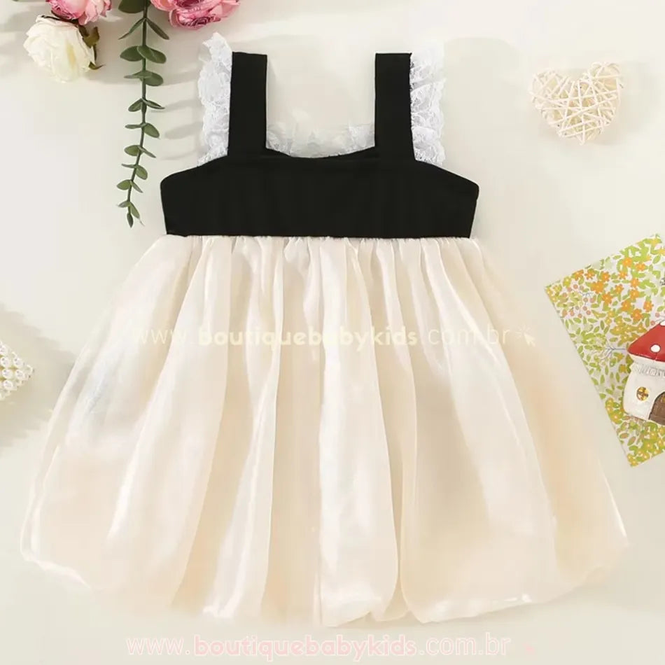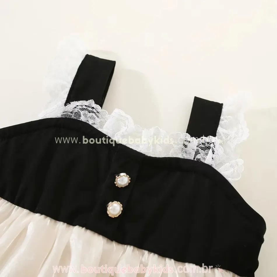 🖤O Vestido Bebê Balonê com Renda e Laços é uma peça encantadora e sofisticada, perfeita para ocasiões especiais. Com um design clássico, ele combina delicadeza e estilo em um único modelo. O corpete em tom preto traz um charme elegante, adornado com dois botões frontais em pérolas, que adicionam um toque de sofisticação.