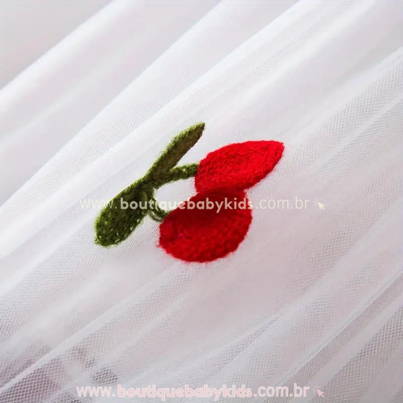 Design Encantador: O vestido apresenta um bordado encantador de cerejas, adicionando um toque alegre e lúdico à peça.