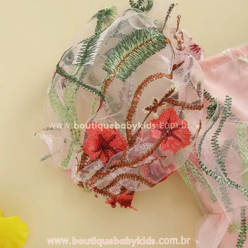 Bordado Floral: O tule transparente é adornado com bordados de flores e folhagens em cores vibrantes e harmoniosas, criando um visual delicado e encantador.