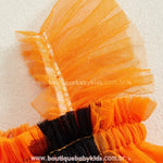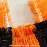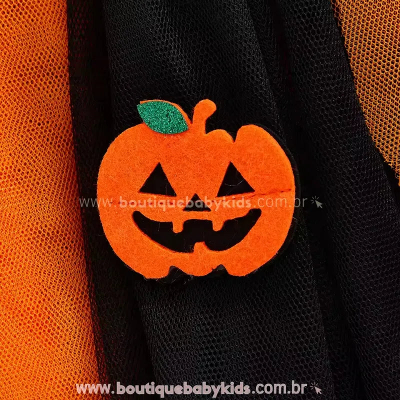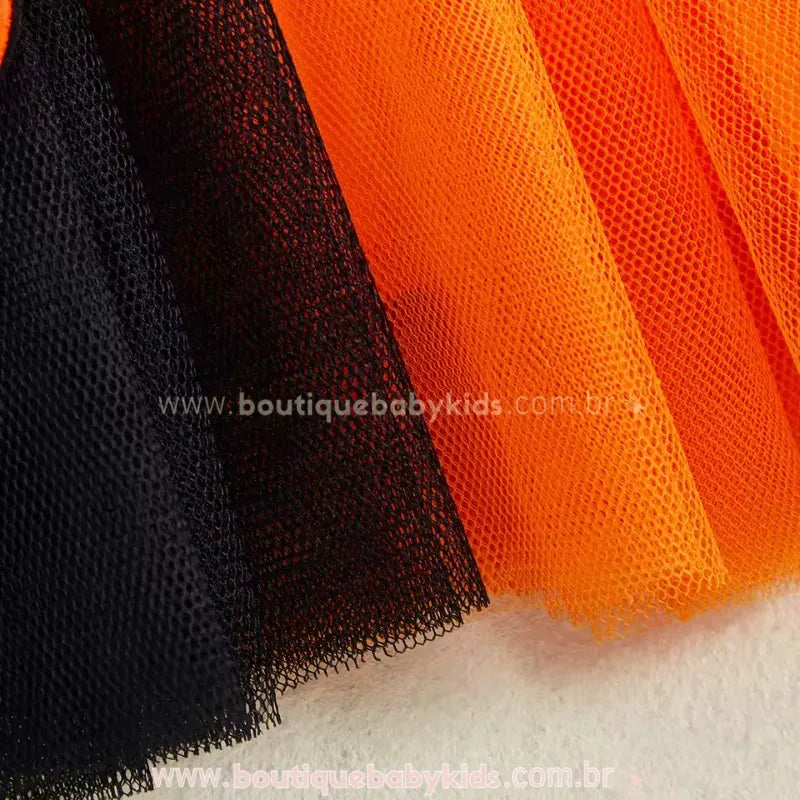 Design Temático de Halloween: Vestido em camadas de tule laranja e preto, adornado com aplicações de abóboras assustadoramente fofas, trazendo todo o clima da data.
