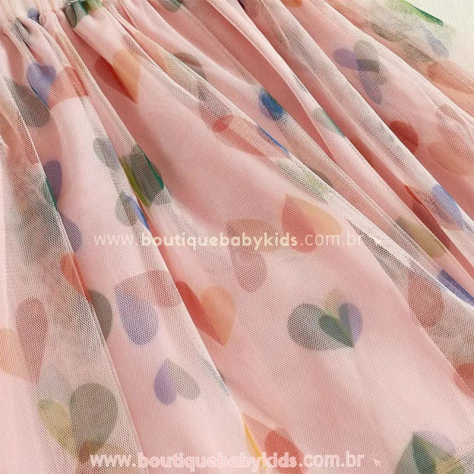 por🩷O Vestido Infantil Tule Estampa Corações é uma peça encantadora, perfeita para momentos especiais ou para adicionar um toque de doçura ao dia a dia das pequenas. Com uma estampa delicada de corações multicoloridos sobre uma camada suave de tule, este vestido traz um visual romântico e cheio de leveza.