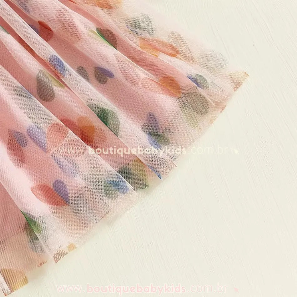 Design Romântico: A estampa de corações coloridos em tons suaves é aplicada sobre o tecido de tule, criando uma aparência delicada e divertida, perfeita para ocasiões especiais.