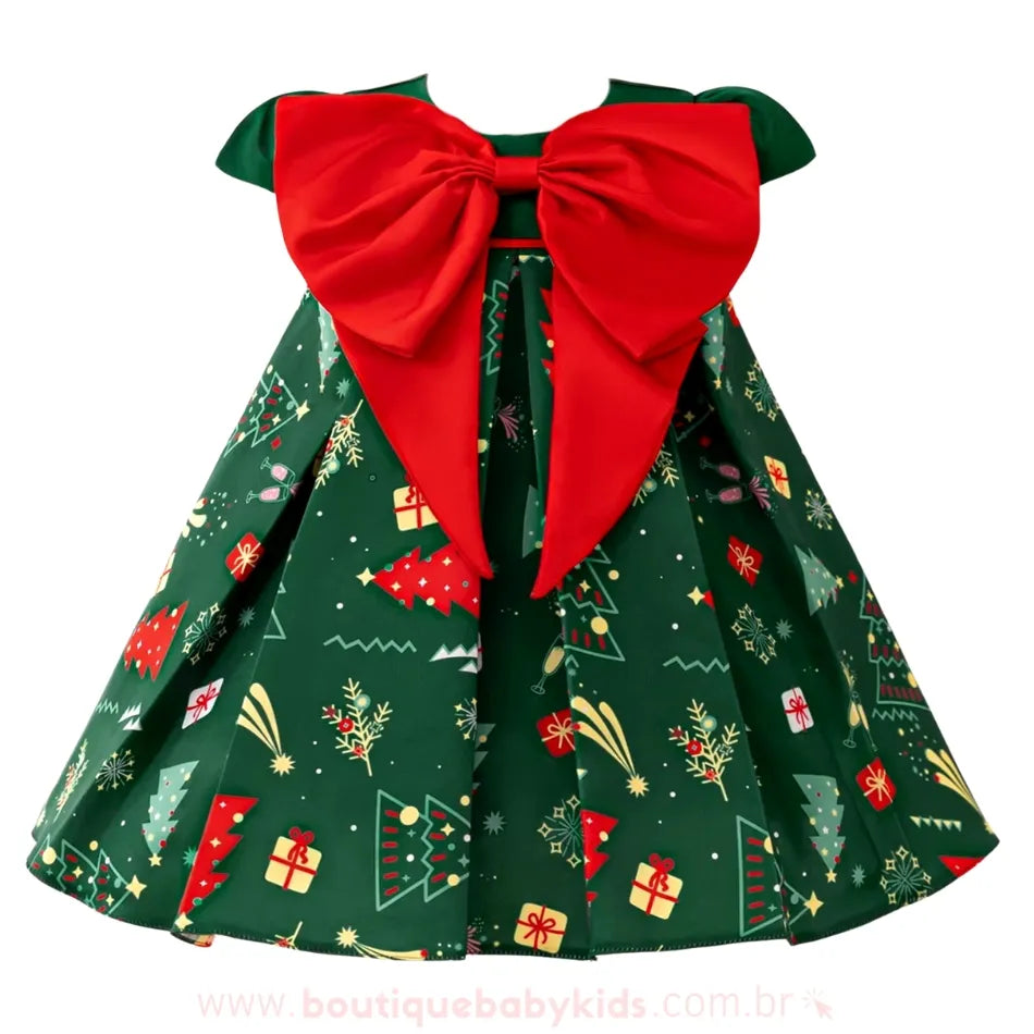Laço Vermelho: O grande laço vermelho na parte frontal do vestido é o toque final que traz charme e sofisticação, capturando a essência do Natal de forma graciosa.